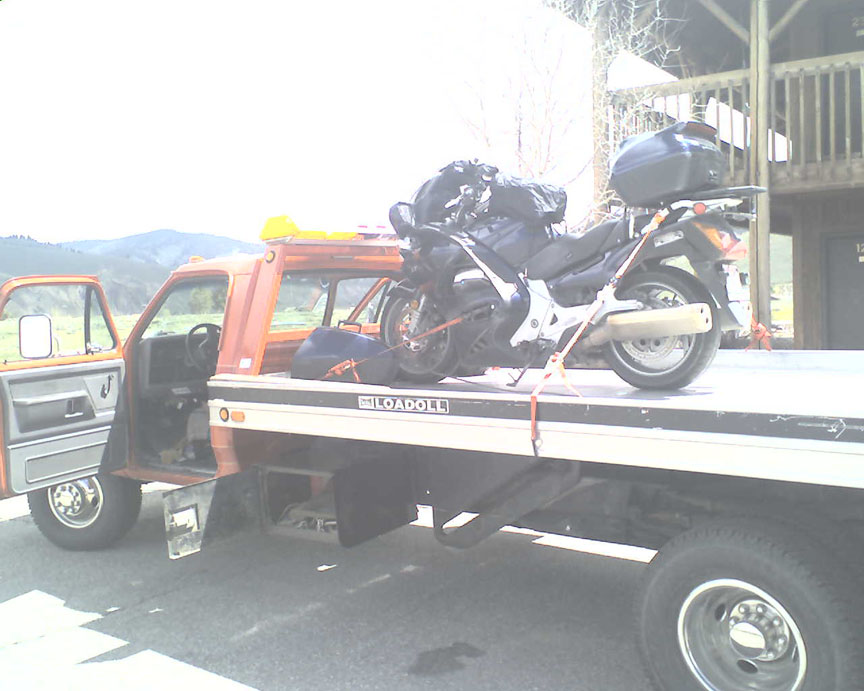 It was a clear morning but cold when again the KLR would not start, Paul pushed it again and it fired up after much cursing by Greg and again concern on his long lasting tire. We thought it may be altitude and cold so we discussed it a bit more. We rode down the pass towards Boise on 21 with great turns and a nice technical section which Paul and I enjoyed a lot on the tight turns with sticky Z6’s. It was warm and sunny as we came down to BMW Big Twin Motorcycles for a 45 minute Z6 tire change and great service again we were on the way with Adam being towed down and on the way later in the day with new Dunlops from his Honda dealer. We got into Baker City and Adam came by a bit later after a light rain in the pass to Baker City, OR and hotel.