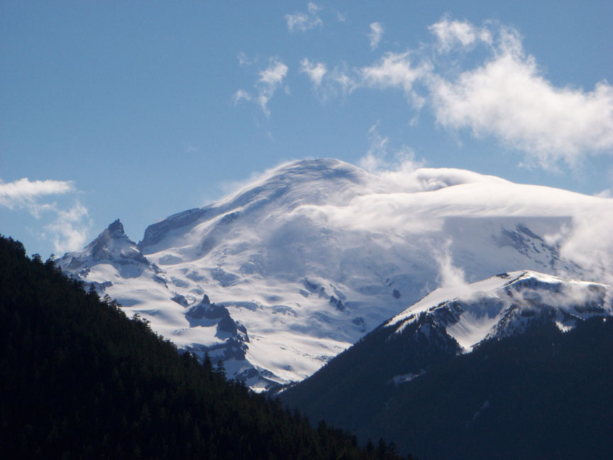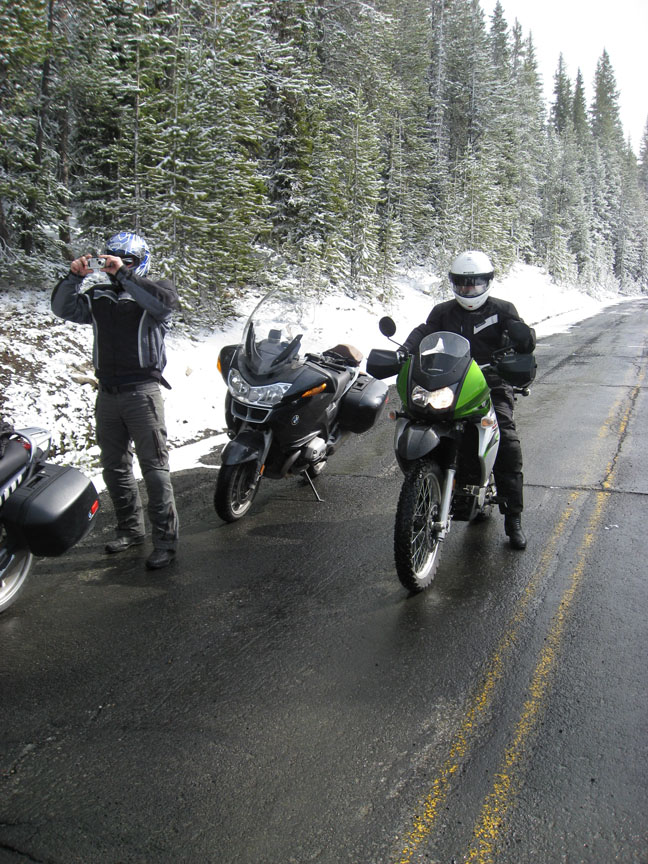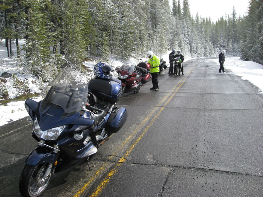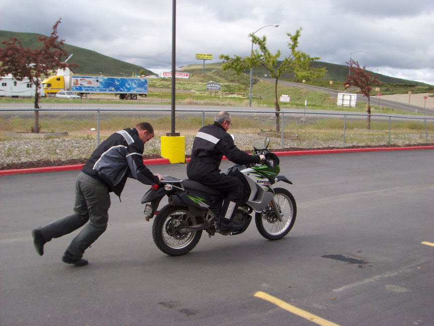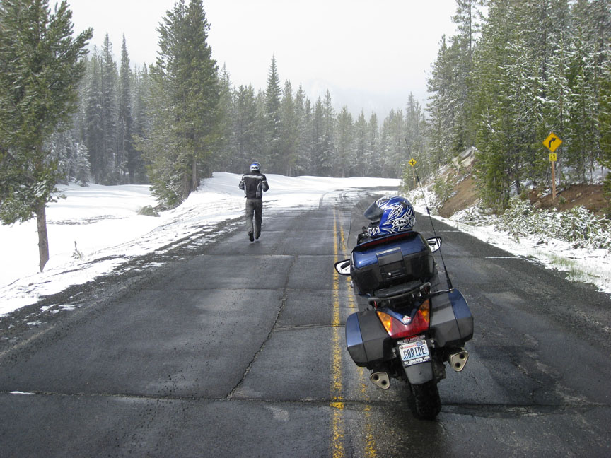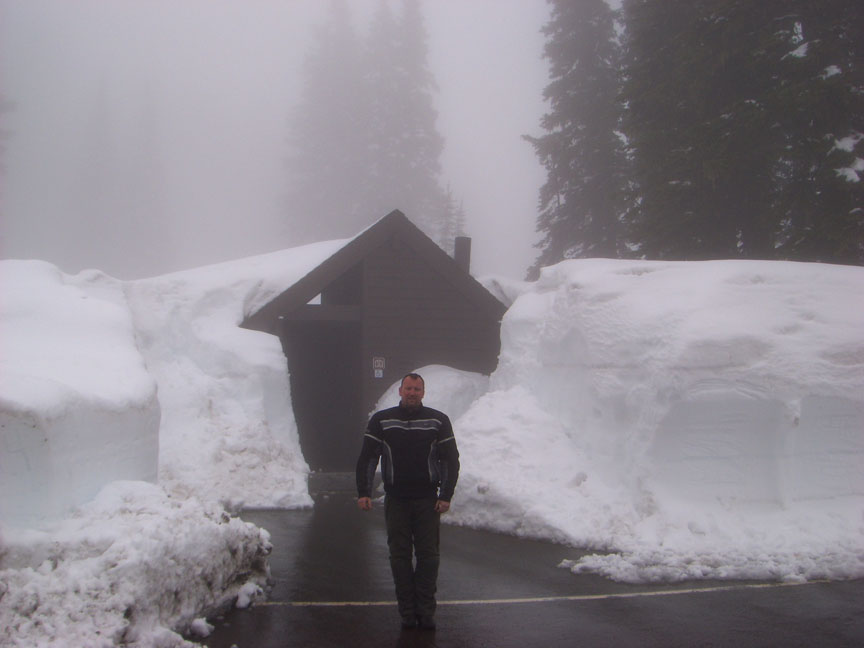 The final day again the KLR would not start so push starting did it again and we were off to Pendleton thru a cold Blue Mountain pass on I84 into Pendleton for breakfast at Shari’s. This is the same place we stopped at on the way home from California so the pictures on the menus helped our decisions! A lady comes up to the table and recognizes us and wants to give us more of the yellow fliers, it was funny to bump into her again. We then headed towards Umatila, the Columbia and the Mabton road which is great road to break up the straightaways. In Yakima , Paul and I pulled off for gas and go via Mt Rainier. Adam, Alan and Greg headed up the freeway with very bad winds via the pass and in Ellensburg. I checked and the pass just opened 2 days ago which tells you what a strange and cool spring we have. We had a great ride up the sunny canyon but at the top fog, 40 yards of visibilty and 10 feet of snow on the sides of the road so we again were at 30-32 degrees before we came down and into Seattle. A great ride with many challenges but I must say gear and watching the conditions and knowing what your bike can or cannot do are critical. Another point was following a car or truck which is indicating or seems to be indicate a turn but then turns the other way so patience in passing is needed as I had a brake light flash right which I thought was turning right but his left light was out and he turned left as I started to pass, almost a T-bone. Greg had one which the trailer was misconnected so left turn indicated really was a right turn.