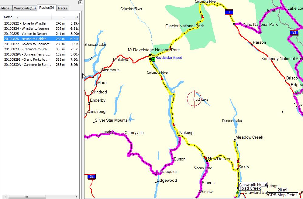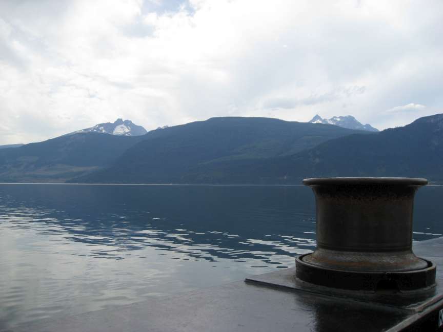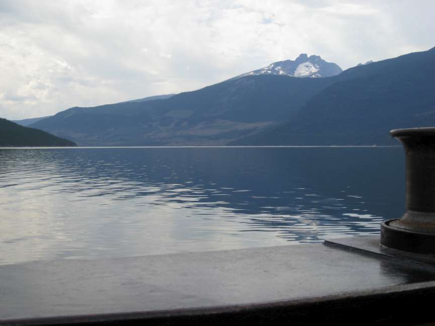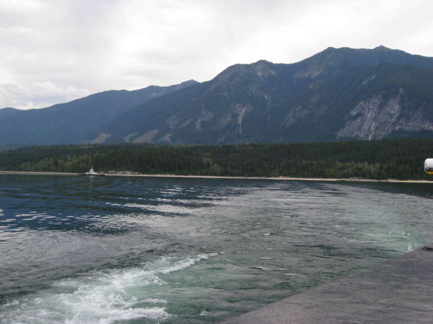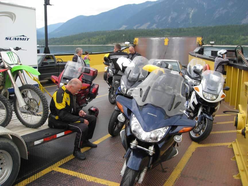 The next day we walked to the Adam’s Cousin’s bakery and had great bagels before riding back to Kaslo and the fun road then north and across a ferry ride to the final drive to Revelstoke. The ferry is no charge and the lake is surrounded by forested peaks and valleys. We had some lunch then pressed on up to Golden which had lots of traffic in the main road and about 10 minutes of rain but forests and granite mountains all around. For dinner we went to the Kicking Horse restaurant where there was less food for more money , not my suggestion! We all were still hungry so Paul asked Adam how much he wanted for his cleanly eaten rib bone for some scraps! Anyway after dinner right to the store for cookies a roasted chicken and humus and Paul made sandwiches for the group, we survived Golden!