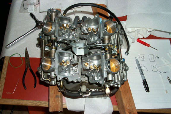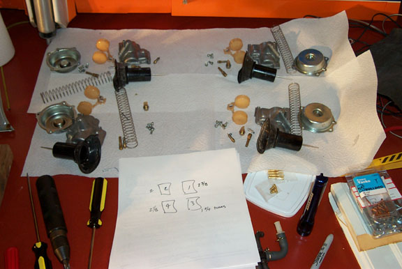 Reinstalling the jets and holders. Keep everything numbered so you don’t mix up the parts. The paper shown shows the number of turns on the idle screws for each carb.