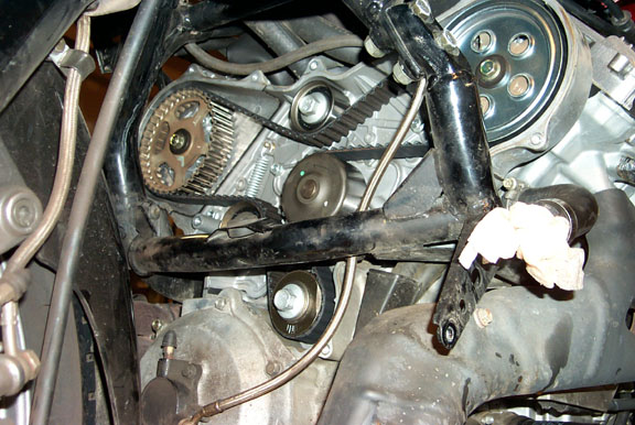 It’s a <little> hard to get the timing belt out with the clutch cover still installed, but a pair of needle nosed pliers did the trick for me freeing it from the driving pulley, (the lowest pulley shown here).