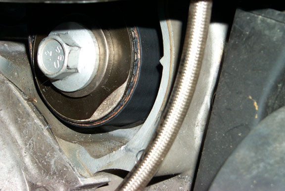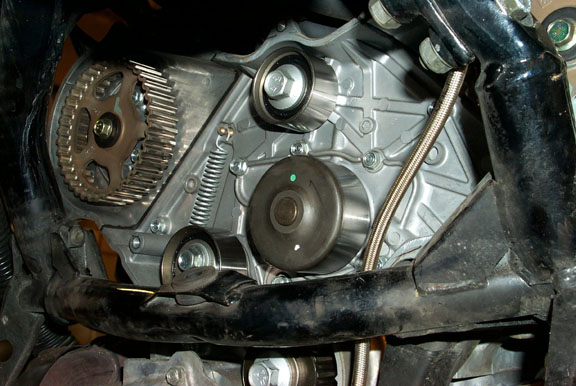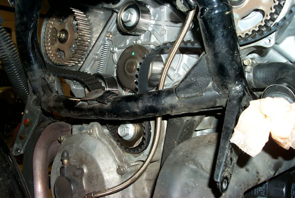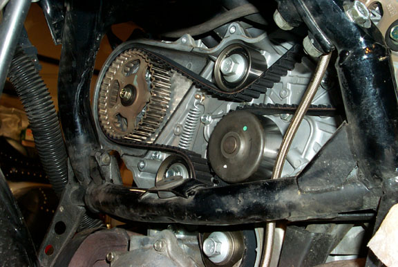 I was pretty lucky and got things all lined up on the first try. The right driven pulley shown here moved about 1/2 a tooth clockwise during the removal/install of the belt, but lined right back up when the tensioner was let loose.