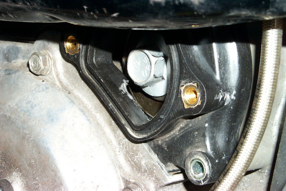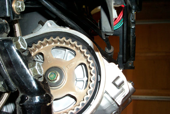 The left side driven pulley all lined up. The ‘up’ indicator on the pulley points to the tooth with the alignment mark that should point to the mark on the case.