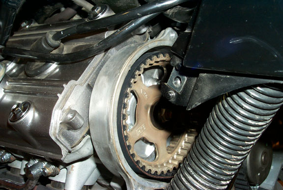 Timing belt removed. The driven pulleys on the cams moved about 1/2 of a tooth when the belt was removed.