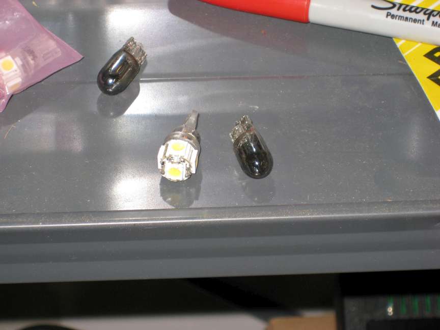 Updated 4/28/2013: I contacted superbrightleds.com and asked if they had any newer LEDs to try. They suggested the WLED-xHP5: 194 LED Bulb – 5 SMD LED Wide Angle Wedge Base WLED-WHP5: Cool White. They claim these seem to be better in high heat applications. Time will tell.