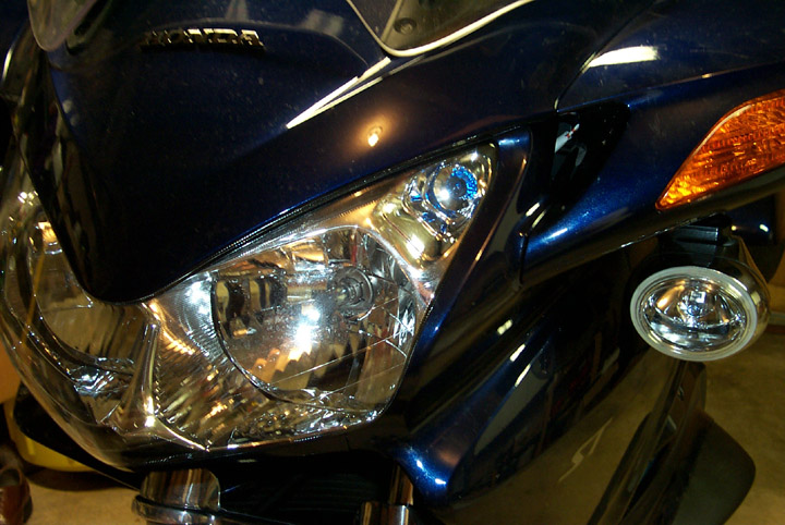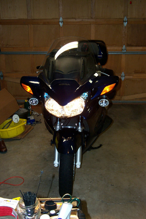 Blue Marker Lights 8/26/2004 These LED lights failed after less than a month of use. 🙁 The lights can be installed by only removing the inner-upper fairings.Just reach up pull the rubber plugs to gain access to the bulbs. Close up.