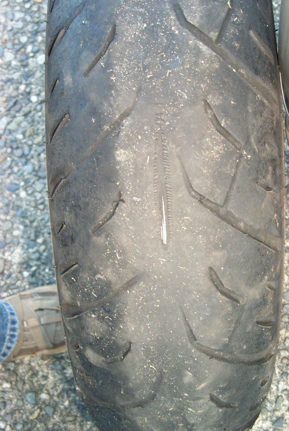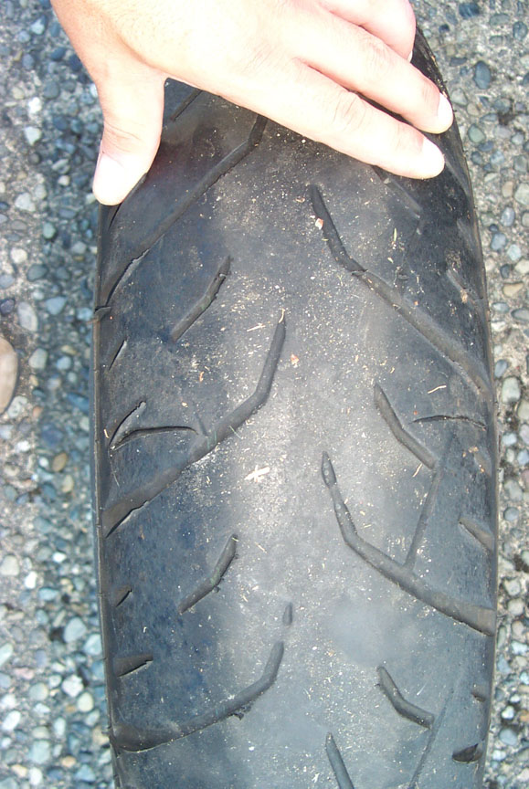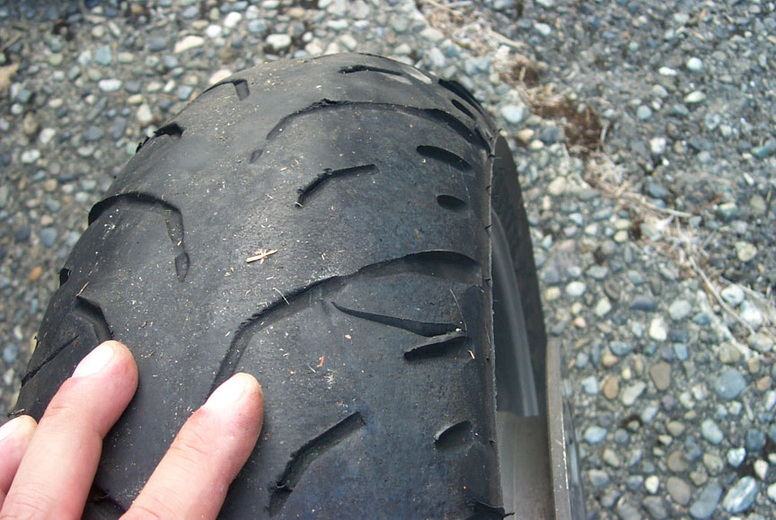 Dunlop D205 Sportmax worn out in 5,000 miles 9/12/2008 Chords showing through Check out the two splits!! Pretty severe cupping and curling of the treads