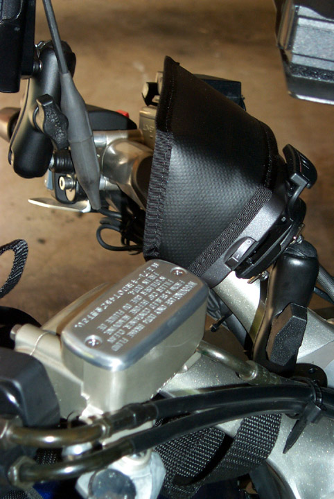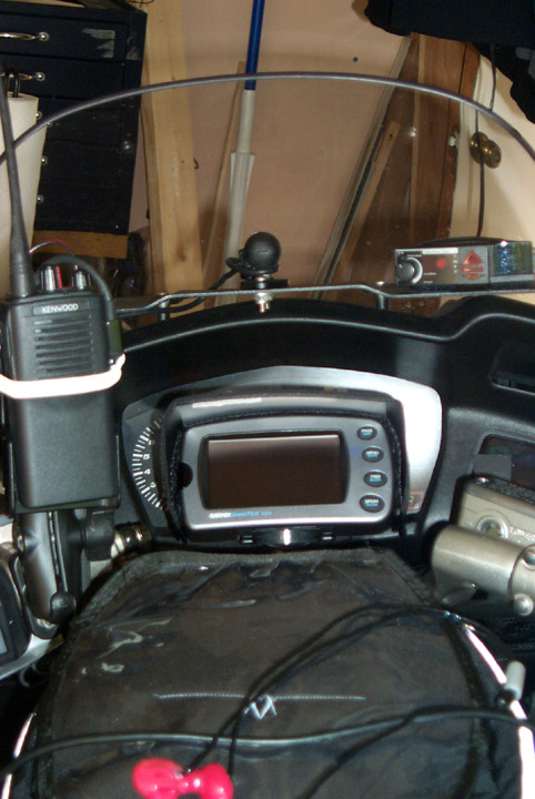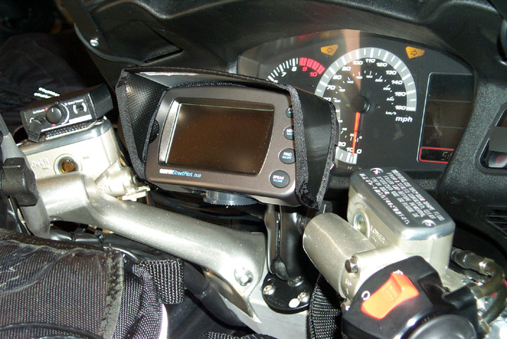 Round RAM mount attached to the accessory screws on the Heli risers. There’s also a round RAM mount attached to a Garmin 2610 motorcycle mount. They are attached to each other with a 3″ RAM arm.