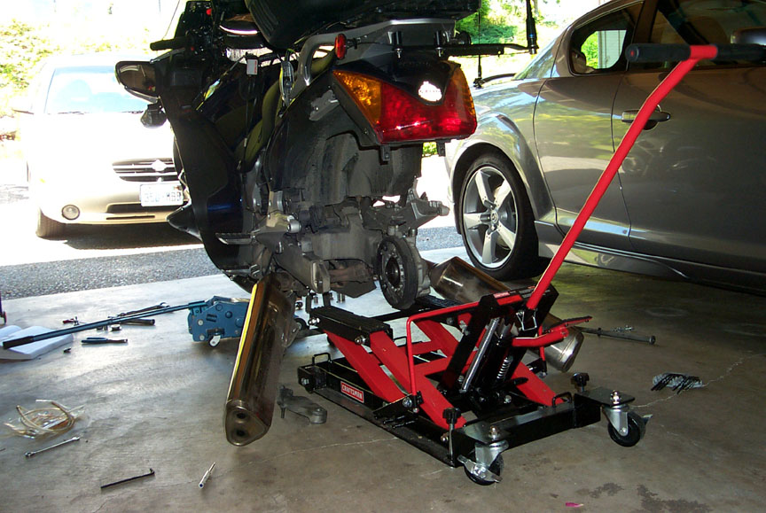 After removing the rear wheel I put my jack under the engine to lift the front wheel.