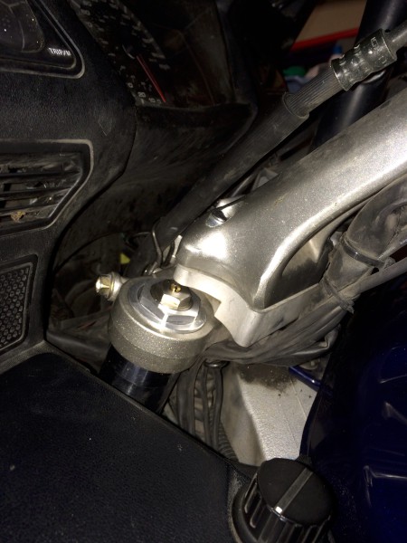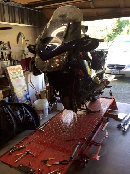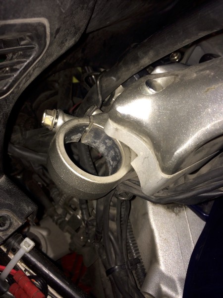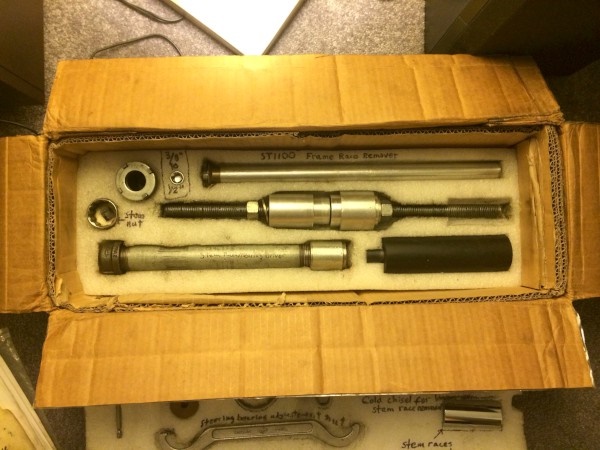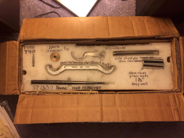 Removing the lower inner race was a bitch! I banged around the interface of the lower dust seal and the lower bridge tree with the cold chisel in the kit. I couldn’t even get it to move for a while. I destroyed the original lower dust seal in the process. Eventually I got the race to move off the surface of the lower bridge. After I had about a 3/16 I tried to lever the race with a large screw driver, but no luck getting it to move. I decided to visit the local dealer to see what they would suggest. The guy at the counter said he’d use a press to push the shaft out of the lower Bridge which would force the lower inner race off the shaft. He said that’s probably what’s in the manual. I don’t think my manual said that?? Anyway, he didn’t have time to look at it so I headed home. I was only able to get the chisel to contact the race in one spot around the circumference which would enable me to hit it down the shaft. Fortunately that was enough to get in moving. Once it was nearly off I could get enough access to the entire race to hit it on spots all the way around the circumference. Installing the new lower, inner race was an easier process thanks to the tool in the kit John supplied. I did have to end up using a maul to get enough impact to get the race seated.