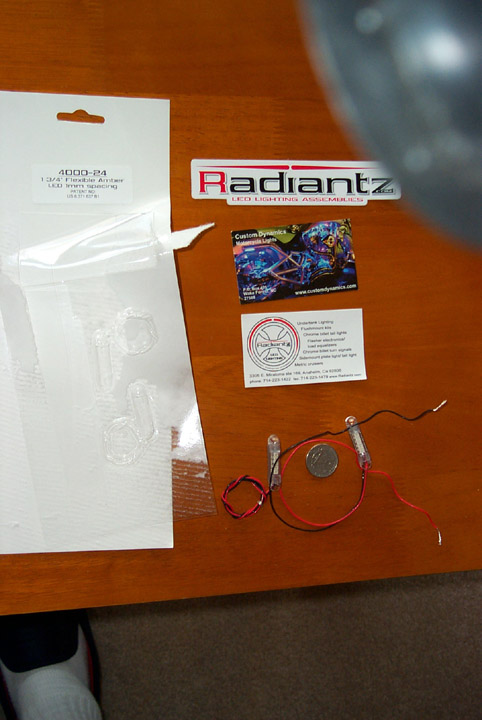 The LED array is about 1.5″ long. Clear plastic with amber LEDs. You can order them here.