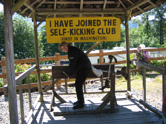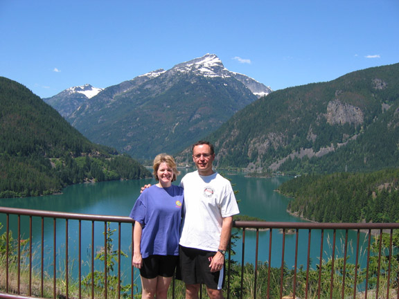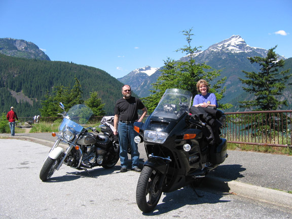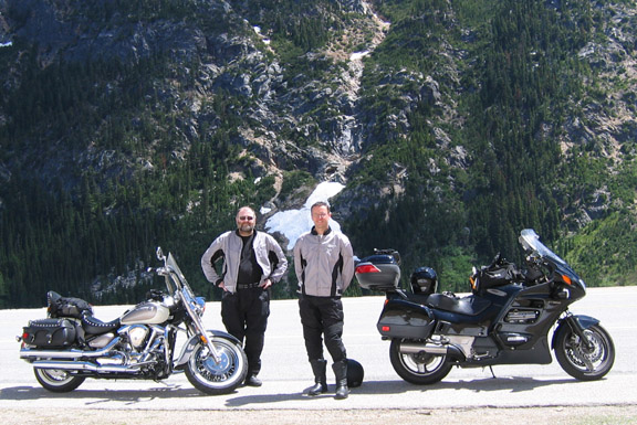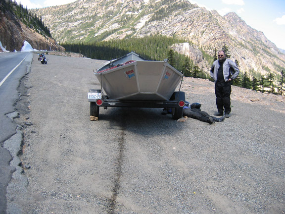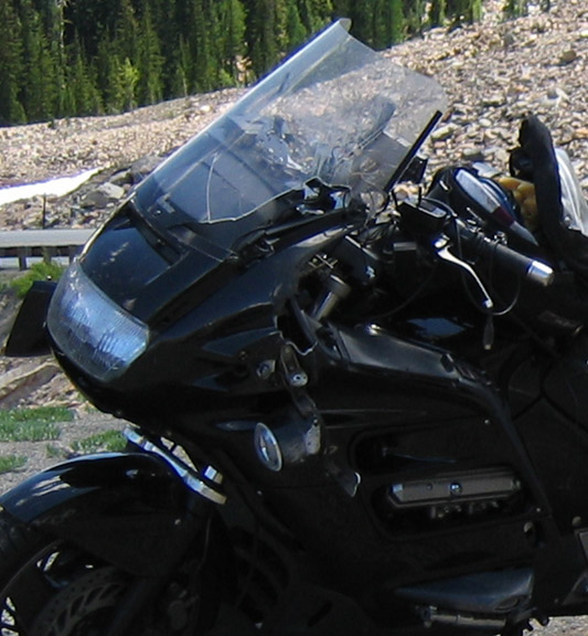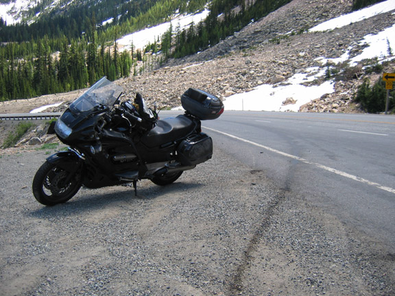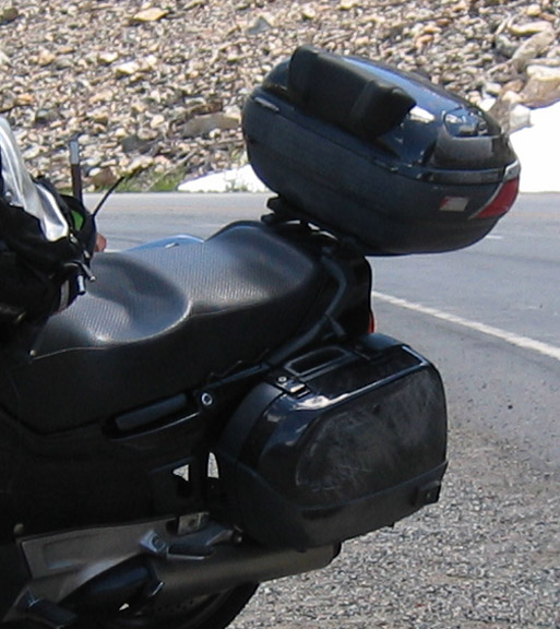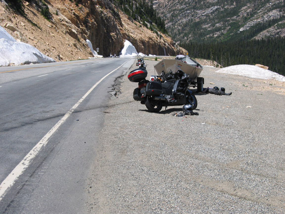 The ST came to rest on its left side, a few feet behind the spot shown here. You can see the gas stain where it came to rest right at the edge of the asphalt. For those of you familiar with Washington Pass we were headed west, up the pass, and were riding through the 180 degree, right hand sweeper. Just as we were exiting the last bit of the turn, the rear wheel slid on some transmission fluid that had been deposited in the lane. I was already looking up the following straight away as the rear wheel began to slide out to the left. The last thing Doreen remembers hearing was me saying some like, “what the heck”, as I realized the rear wheel was washing out. I <thought> we were going to just low side, but judging from the damage to the bike and the tumble I took, I’m assuming I hung on until the high-sided while Doreen came of during the low side. Doreen slide feet first, face down up the road. Her jacket slid up pretty high resulting in road rash on her stomach and chest. I don’t remember much after thinking I was going to low side. I do remember my head hitting several times and my limbs flailing as I rolled. I was seeing road-sky-road-sky and was just thinking to myself, “don’t reach out and try and stop this” and “when am I going to stop?”. The left side is pretty much crunched from the mirror to the left luggage box and the GIVI.