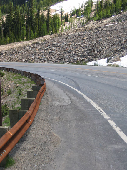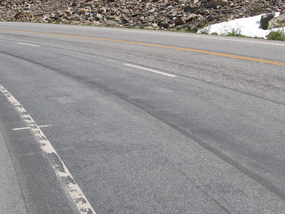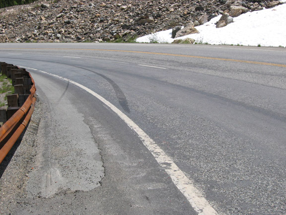 This picture is taken from the end of the guard rail looking back down the road. If Doreen and I left the bike at the end of the skid marks it looks like we slid quite a ways! See the picture below.