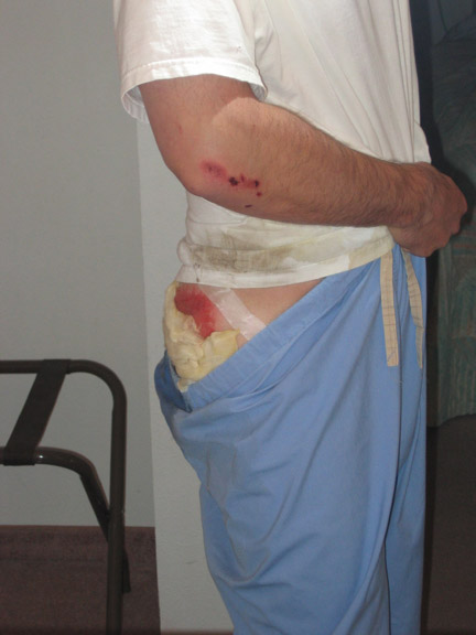 More rear damage! After waiting about an hour for an ambulance to arrive, Doreen and I were taken for a 1 hour ride to the closest hospital in Brewster, WA. X-rays confirmed neither one of us have any broken bones and for the <most> part our safety equipment performed well. Doreen got the worst of it as she appears to have slid feet first, face down, for a while. Her jacket slid up her waist and she had road rash from her belly button to her upper chest. Along with that she has a bruised right elbow and left shoulder. I have about a 6″ round road rash/bump on my left hip and a smaller version on my left elbow. All in all, we were pretty lucky.