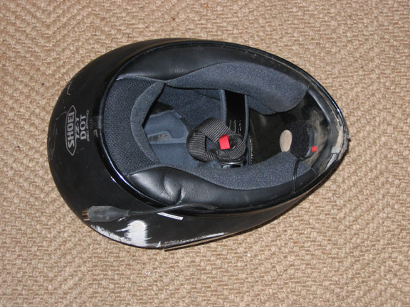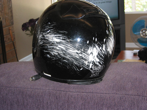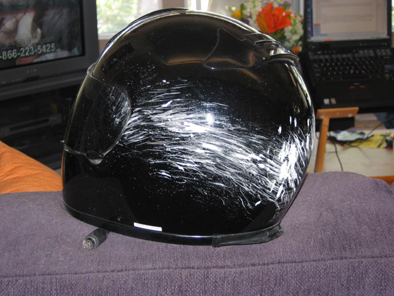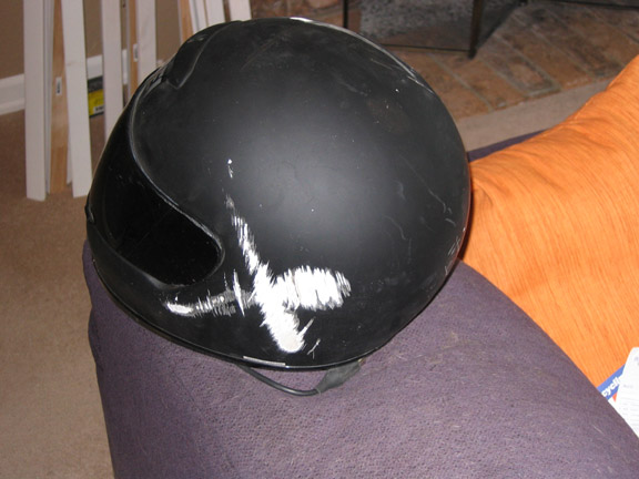 Check out the chin guard on Doreen’s helmet. It scooped gravel as she slid backwards.